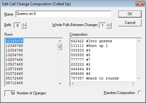 You can alter the name or the composition details using normal editing controls - see Adding Call Change Compositions for information on the format of call change compositions and how to add and alter them. When you have finished editing the composition, click on OK to save the new composition, or click on Cancel to abandon your changes and revert to the original composition.