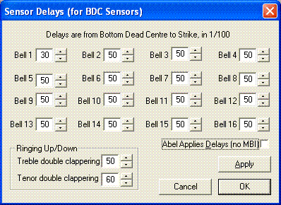 David Bagley's Multi-Bell Interface (MBI) is designed to detect when a turning bell passes bottom-dead-centre, and then send a signal to Abel after a fixed time. You have to tell Abel how long this time should be, for each bell, and Abel will send this information to the Interface when you click the OK button on the External Bells dialog. Similarly, if you connect a sensor with a single bottom-dead-centre activator to one of the PC's COM port control signals, Abel can apply an appropriate fixed delay to the signal. In either case, you click on the Sensor Delays button, and a new dialog will appear.