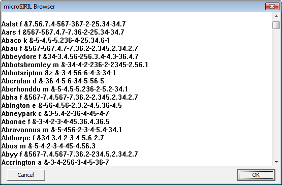 Alternatively, if you click the Browse button, Abel will show a list of the names and place notation for the methods in the selected microSIRIL library, so that you can browse for one that you want. For example, for Surprise Major:
